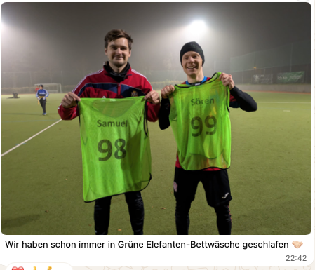 Bei eisiger Kälte und mit erstaunlich vollen 14 Mann auf dem Platz entwickelte sich ein intensives Duell zwischen Team Bunt und Grün. Bunt legte stark los und ging früh deutlich in Führung, zwischenzeitlich stand es 4:1. Doch Grün kämpfte sich mit viel Einsatz und Moral zurück, glich zum 4:4 aus und hätte mit etwas mehr Glück sogar führen können. Der grüne Keeper zeigte mehrfach starke Paraden und hielt sein Team im Spiel, doch am Ende setzten sich die laufstarken Bunten mit zwei späten Treffern zum 7:5 durch. Zum Abschluss gab’s noch eine Kiste Bier von Geburtstagskind Martin – Prost und alles Gute! 🍻