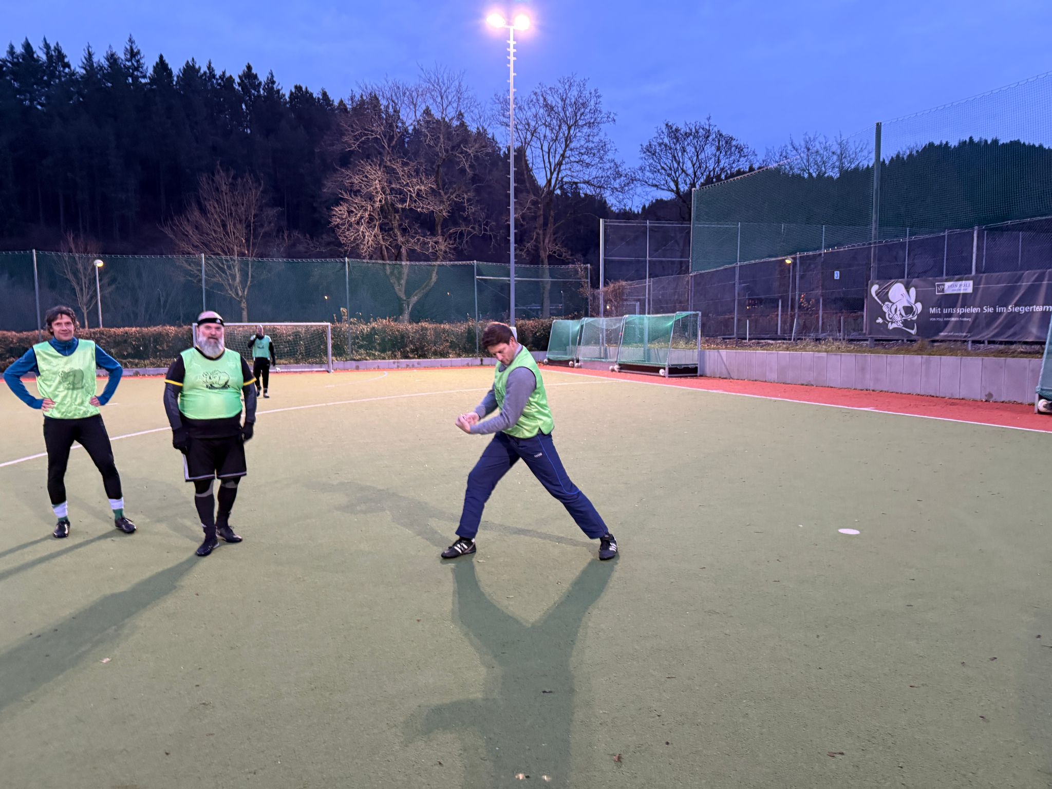 Die Blauen haben es in der Folge besser verstanden, etwas mehr Struktur, Tempo und Präzision in ihr Spiel zu bringen. Blau kam immer wieder gefährlich vors Tor, brauchte jedoch die Erfahrung und Coolness des Dauerbrenners, der eine schöne Ballstafette mit dem 1:1 krönte. Die Blauen blieben dran und erhöhten zwischenzeitlich auf 3:1 (bitte Torschützen und wenn erwähnenswert die Entstehungsgeschichte der Tore ergänzen). Blau hatte im Anschluss vier Chancen, das Spiel endgültig zu entscheiden, aber Michael hielt alles exzellent und damit das Spiel offen. Die Grünen Angriffe liefen nun auch besser, die Blaue Abwehrkette und Bene hielten aber beherzt dagegen. Bei einer Ecke übersah Ingo seinen Gegenspieler Fränkie und rammte diesem mit Wucht sein Zwerchfell in die Schulter, Fränk hat es gut überstanden, Ingo blieb kurz die Luft weg (Ingos Gesichtsfarbe wechselte von gesund zu bleich zu bläulich – und zurück…).