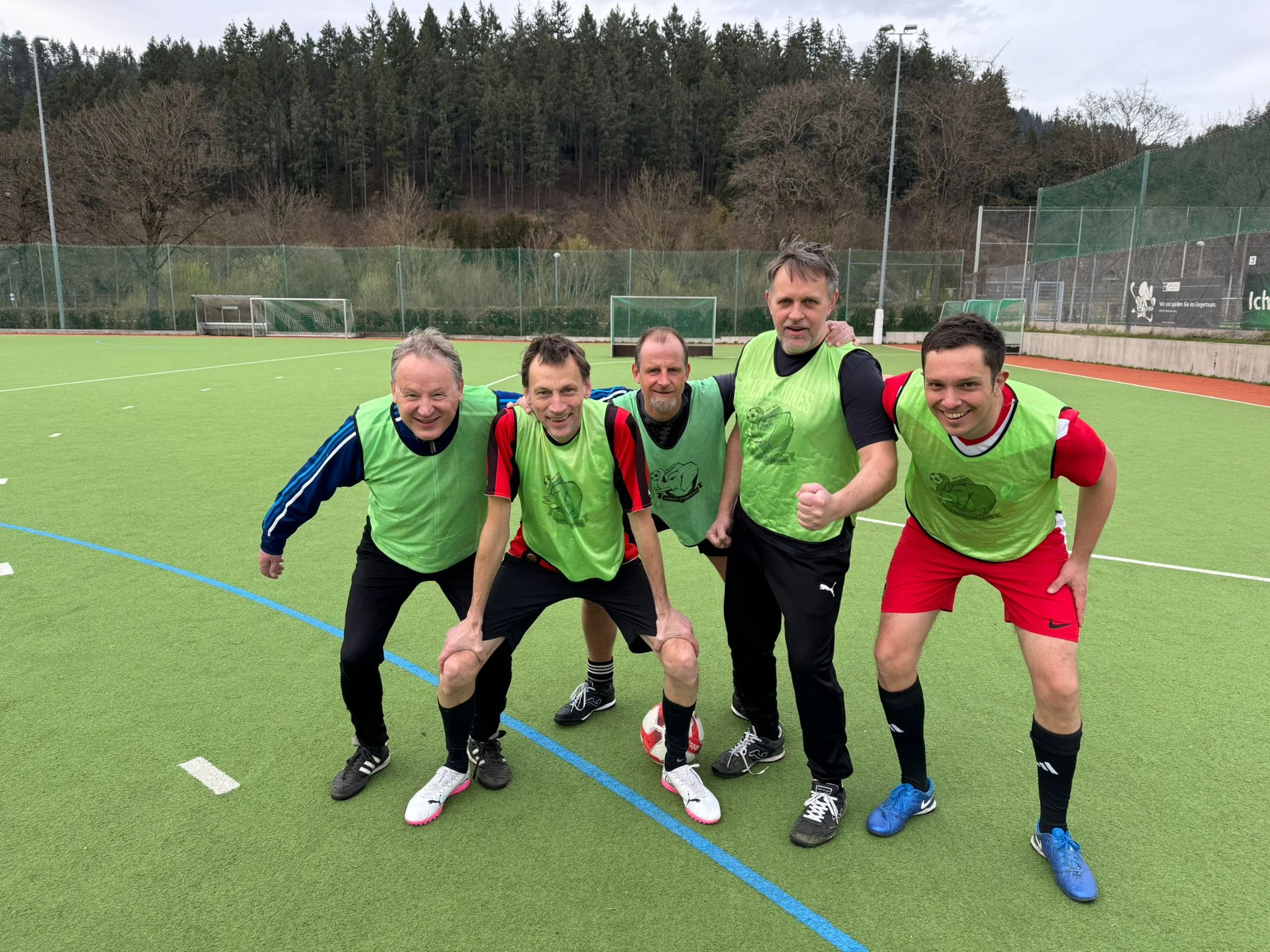 So wie grün einer weniger war, war bunt einfach einer mehr. Das machte sich bemerkbar. Anfangs startete Horst im Tor – ein Fehler, denn die 6 war dadurch nicht adäquat besetzt. Das machte sich dann trotz Horst Torhüterqualitäten im Tor bemerkbar. Martins Einsatz im Tor war nur von kurzer Dauer. Zwar sorgte Horst vor dem Tor wieder für Ordnung, aber der eine oder andere vereinzelte Abschluss ging dann doch rein. Nur gut, dass Johannes, Marc und Sören das Runde ins Eckige auf der anderen Seite brachten, es kommt ja auf den Saldo an.